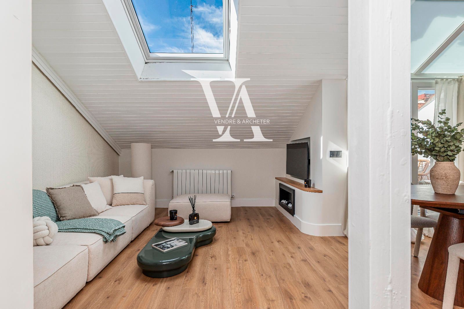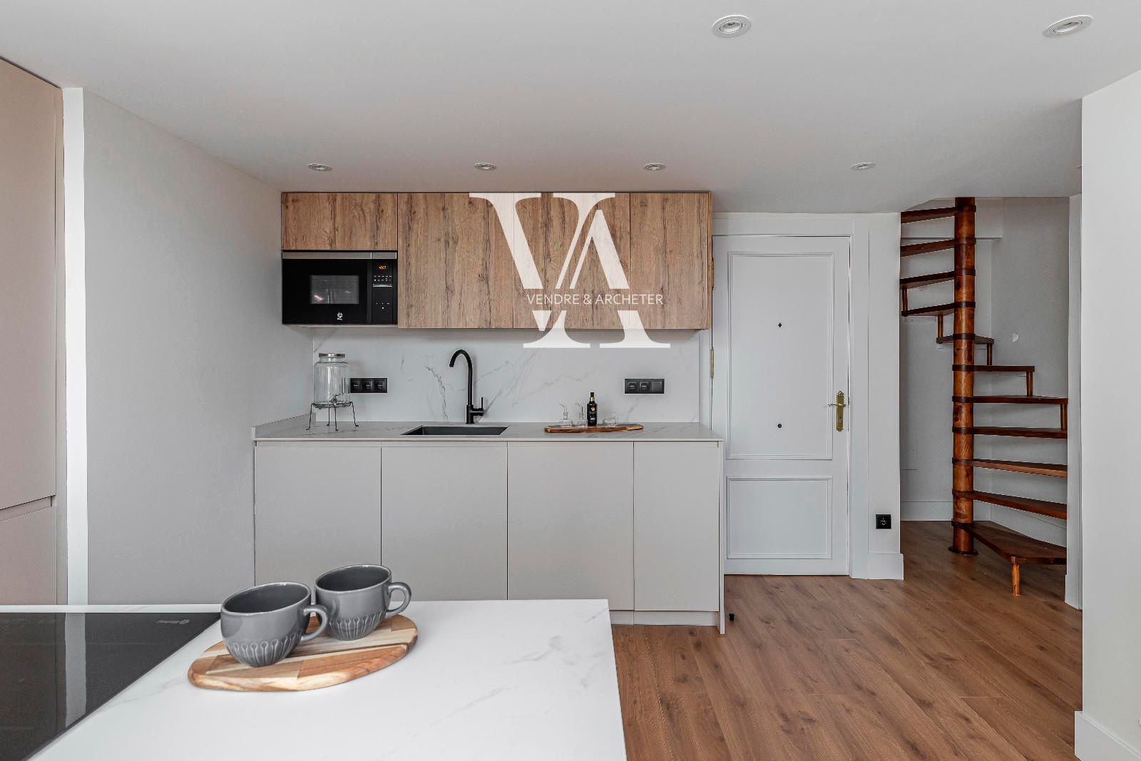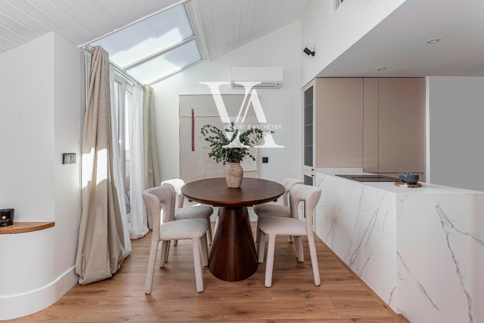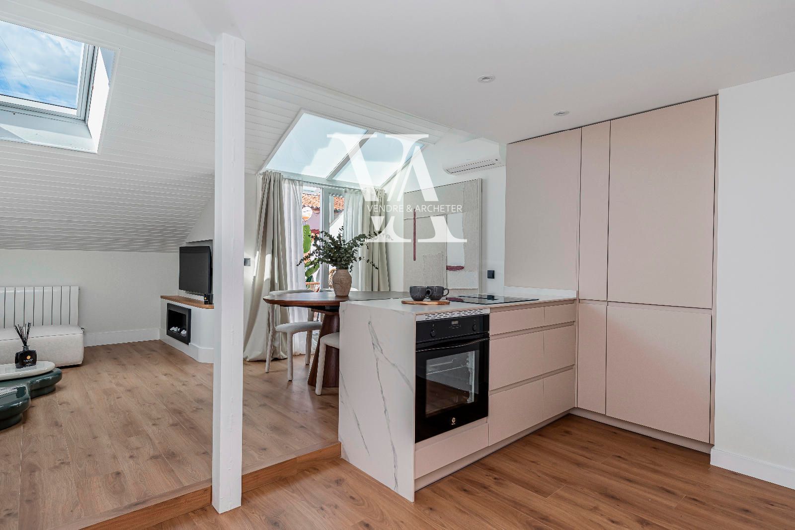 Situado en una cuarta planta, el dúplex se distribuye en dos niveles. En la primera planta se encuentra un amplio salón-comedor con cocina integrada, un espacio abierto y funcional ideal tanto para el día a día como para recibir invitados. Grandes ventanales aportan abundante luz natural y dan acceso a una terraza privada, perfecta para desayunar al aire libre o relajarse al final del día. En esta planta también hay un aseo de cortesía.